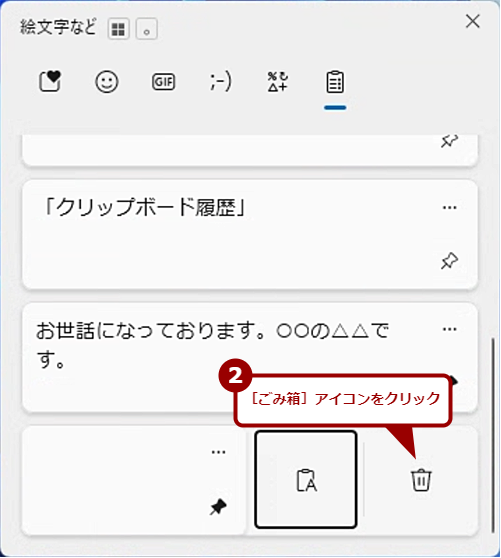 「クリップボードの履歴」の「ピン留め」を解除して項目を削除する方法