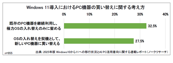 A: OS移行において、既存PCを活用しOSのみ入れ替える企業は32.5%、新しいPCに買い替える企業は27.5%であり、大きな差は見られない。これはWindows 11はWindows 10に比べてハードウェア要件が厳しくなっているため、ユーザー企業は積極的にPC買い替えを選択しているわけではないとノークリサーチは分析。