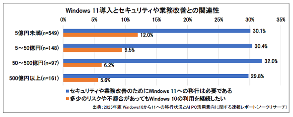 一方で、今回の調査では企業規模にかかわらず、3割の企業が「セキュリティや業務改善のためにWindows 11への移行は必要」と回答している。このことから取り組み状況に違いはあるものの、移行の必要性に関する理解が広がっているっことが分かる。