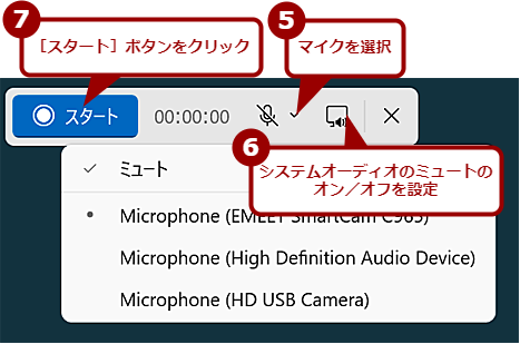 Snipping Toolのツールバーがこの形になるので、マイクやシステムオーディオを設定する。マイクを使って、録音しながら録画したい場合は、[マイク]アイコンのプルダウンリストを開き、入力先のデバイスを選択する。マイクが接続されていない場合は、デバイスのリストが表示されない。また、システムオーディオをミュートしたい場合は、[システムオーディオ]ボタンをクリックしてミュートに変更する。設定が完了したら、[スタート]ボタンをクリックして録画を開始する。