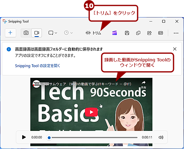 録画を終了すると、Snipping Toolウィンドウが開き、録画した動画が確認できる。動画の前後の不要な部分を削除したい場合は、[トリム]をクリックする。
