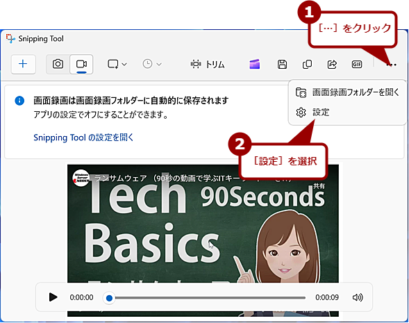 デフォルトでは、自動的に画面録画フォルダ([%userprofile%\Videos\画面録画]フォルダ)に動画が保存されるようになっている。自動保存を無効にしたり、保存先を変更したりしたい場合は、[…]アイコンをクリックして、表示されたメニューの[設定]を選択する。