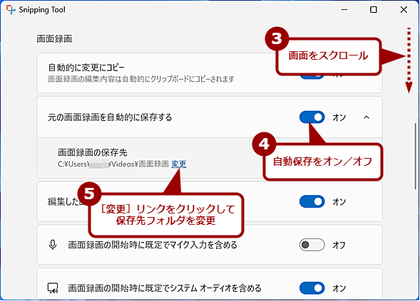 また、保存先を変更したい場合は、「元の画面録画を自動的に保存する」を展開し、「画面録画の保存先」に書かれたパスの右側になる[変更]リンクをクリックして、保存先を指定すればよい([変更]リンクが分かりにい点に注意)。