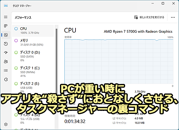 重要な作業の最中、PCの動作が急にカクカクになった、そんな経験はないだろうか? こんなとき、CPU使用率が高いアプリを強制的に終了していたかもしれない。しかしWindows 11で実装されている「効率モード」を使えば、アプリを強制終了せずにCPU使用率が下げられる。本Tech TIPSでは、この「効率モード」の使い方について解説する。