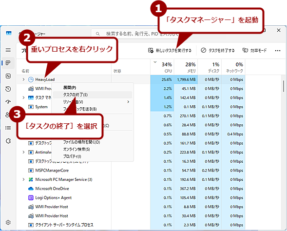 タスクマネージャーを起動し、[プロセス]タブを開くと、プロセスの一覧が表示される。ここで、CPUの使用率が高いプロセス名を右クリックし、表示されたメニューで[タスクの終了]をクリックすると、プロセスを強制終了できる(画面中の重いプロセスの例としている「HeavyLoad」は、JAM Softwareが提供しているストレステスト用ツール)。