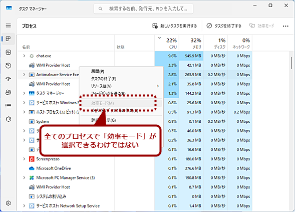 ただし、Windows 11のシステムにとって重要なプロセスなどを「効率モード」に設定することはできないので注意してほしい。