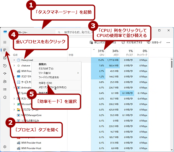 [Ctrl]+[Shift]+[Esc]キーを押して「タスクマネージャー」を起動する。[プロセス]タブを開いたら、「CPU」列をクリックして、CPUの使用率順に並べ替える。負荷の高い(重い)プロセス順に並んだら、「効率モード」にしたいプロセス名を右クリックして、メニューの[効率モード]を選択する。
