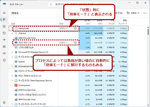 「効率モード」になると、「状態」列に「効率モード」と表示される。プロセスによっては、PCの負荷が高い状態になると、自動的に「効率モード」に移行するものもある。
