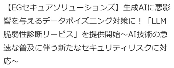 EGセキュアソリューションズは2025年9月17日、大規模言語モデル(LLM)の脆弱(ぜいじゃく)性を特定してリスクを減らすためのセキュリティサービス「LLM脆弱性診断サービス」の提供を開始した。