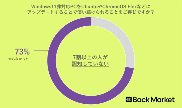 一方でサポート終了後もWindows 11にアップグレードできないPCを使い続ける選択肢はある。例えば、Linuxディストリビューションの一つである「Ubuntu」や、LinuxをベースにしたGoogleのOS「ChromeOS Flex」に移行する方法がある。調査ではこの方法を「知っていた」と答えたのは27.7%だった。