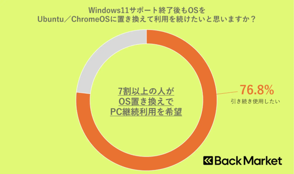 調査では、UbuntuやChromeOS Flexへの移行によってPCを再利用できることを知った人の76.8%は「今のPCを使い続けたい」と回答し、OSの移行に前向きだった。Windows 10のサポート終了を機に、単にPCを買い替えるのではなく、再利用という選択が広がる可能性があることを示している。