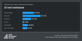 Stack Overflowの「2025 Developer Survey」では、開発プロセスにおけるAIツール活用について「すでに利用している、または利用予定」と回答した割合が全体で84%に達しており、プロフェッショナル開発者の約31.8%はAIエージェントをすでに活用していると回答しています。