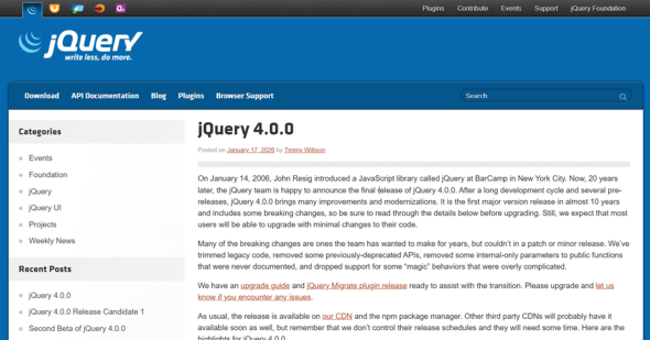 オープンソースプロジェクトのOpenJS Foundationは2026年1月17日(米国時間)、JavaScriptライブラリ「jQuery」の最新メジャーバージョンとなる「jQuery 4.0.0」を正式リリースした。2016年にリリースされたバージョン「3.0.0」以来のメジャーアップデートであり、広範なコードのクリーンアップと最新のJavaScript標準への対応が行われている。