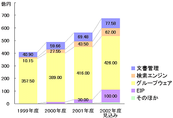 2001年度の市場規模は562億円、内訳的にはグループウェアが大半を占めるが、伸び率はそれ以外の要素が大きい。2002年度見込みは市場全体で676億円、EIPに関しては300%以上の成長が予想されている。