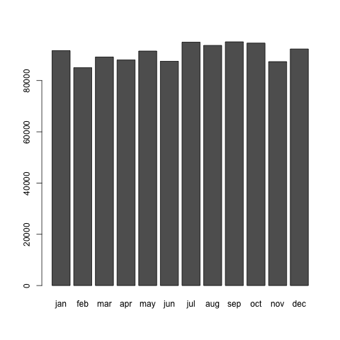 japrecentには1975年から1990年までの日本人の月別の出生数が入っています。data.japanから1975年から1990年までの行を切り出し、カラム方向で和をとるためにapply関数を利用してsum関数を適用しています(この説明については別の回でも繰り返しますので、理解できなくても大丈夫です)。この結果をbarplot関数によりプロットしました。