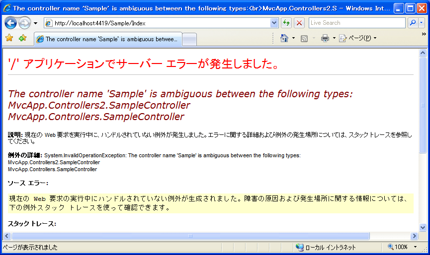 MvcApp.Controllers名前空間とMvcApp.Controllers2名前空間とでSampleコントローラの名前が重複して存在するため、いずれのコントローラを実行してよいものか、判定できないのだ*2。