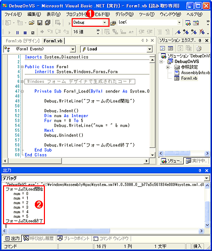 次の画面は、DebugクラスのWriteLineメソッドを使用したコードをDebugビルドで実行しているところである。この画面で分かるように、Debugクラスによるデバッグ・メッセージの出力は、VS.NETではデフォルトで[出力]ウィンドウに表示される。画面はWindowsアプリケーションの場合であるが、Debugクラスを使用したこの機能は、Webアプリケーションであってもまったく同様に利用できる。