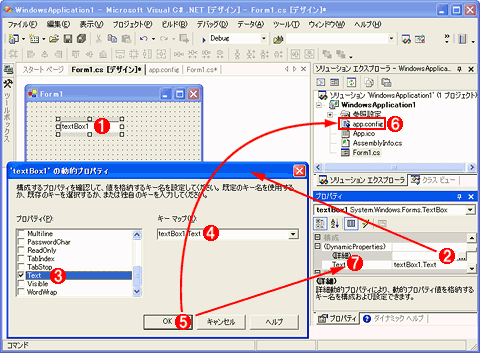 プロパティの値がアプリケーション構成ファイルから設定されるようにするには、VS.NETの[プロパティ]ウィンドウで、対象となるフォームやコントロールの[(DynamicProperties)]プロパティを設定すればよい。具体的の手順は、次の画面のとおりだ。