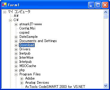 次の画面は、本稿で作成するWindowsアプリケーションのサンプル・プログラムである。このアプリケーションでは、エクスプローラの左側にあるツリー表示と同じように、利用可能なドライブとその配下にあるディレクトリの一覧を表示する。