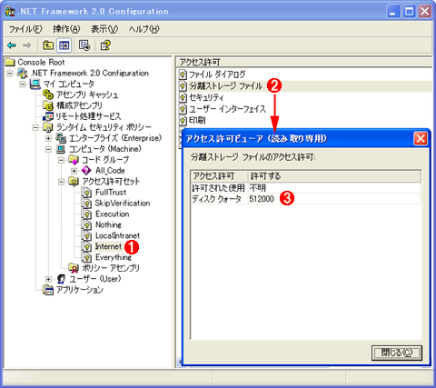 次の画面は実際に「Microsoft .NET Framework 2.0 構成」を利用して、Internetゾーンにおけるディスク・クォータを調べているところだ。