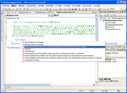 * WindowsFormsApplicationBaseクラスにはスプラッシュ・スクリーンの作成を行うための(OnInitializeメソッドから呼び出される)OnCreateSplashScreenメソッドが用意されているが、このメソッドはVB 2005により自動作成されるコードでオーバーライドされるため、それをわれわれがオーバーライドすることはできない。 |