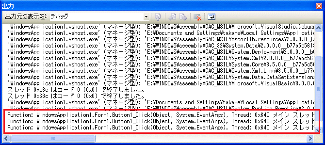 Function: WindowsApplication1.Form1.Button1_Click(Object, System.EventArgs), Thread: 0x64C メインスレッド