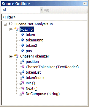 Source Code Outliner PowerToyをインストールすると、IDEの[表示]−[そのほかのウィンドウ]メニューに、[Source Outliner Power Toy]という項目が追加される。これを選択すると、現在編集中のソース・ファイルに含まれるクラスやメソッドをツリー表示したウィンドウが開く。
