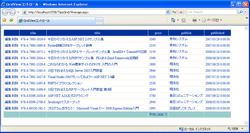 以下の画面は、「TIPS:[ASP.NET]GridViewコントロールでデータソースの内容を表示するには?」で作成したグリッド表を基に、データベースに登録されている書籍単価の平均値を求め、フッタ行に表示したものだ。