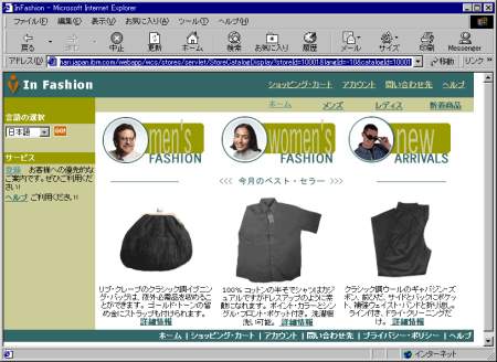 上記のInterestItemAdd(ショップカートに追加)といった基本的な機能はWCSの製品を導入すればすぐに使い始めることができる。製品には図4のように商品データも含んだサンプルのストアが提供されるので、それを使用すれば簡単に実際のストアフローを見ることができる。しかし実際にお客さまがECサイトを作成する際には、HTMLとして表示される部分の見た目をはじめとしてストアフローの変更や新規機能の追加などのカスタマイズを行うことが通常の流れになる。その場合のカスタマイズのポイントは2点だ。1つがJSPを中心としたプレゼンテーション・ロジックの変更、もう1つがJavaコマンドのカスタマイズによるビジネス・ロジックの変更だ。