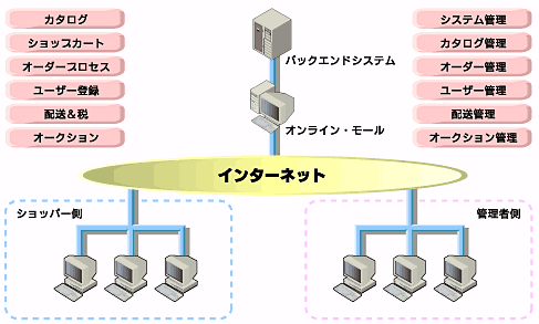 インターネット上にストアを開き、広くWebユーザーに対し商品の販売を行う。こうしたECサイトを作成/管理するためには多彩な機能が求められる。サイトを訪れる顧客であるショッパー側から見ると、まず商品カタログの表示、ショップカート機能、配送料金や税金の計算を経てオーダー実行といった機能は最低限必要で、加えてオークションや個人情報に基づいた商品のお薦めなどといった機能を利用して差別化を図る。転じてサイトの管理者側から見ると、販売する商品の管理(商品入れ込み、変更、在庫の確認)、売り上げオーダーの手配、ショッパーの登録情報管理などに始まり、ショッパーの差別化やキャンペーン/オークションの管理など、ショッパーに対しきめ細かなサービスを提供するための機能が重要視される。