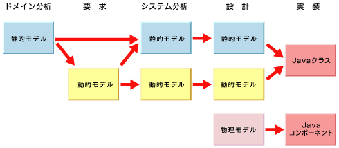 この中でJavaとモデルの関係が出てくる個所は2つです。1つは明白で、設計モデルからJavaクラスへのマッピングです。もう1つは、システム分析モデルから設計モデルを構築する作業です。というのは、設計モデルはJavaによる実装を前提としたモデルになるからです。つまり設計モデルの作成は、ある意味Javaプログラミングであるともいえるわけです。