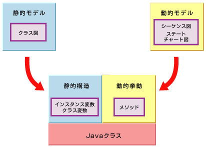 UMLとJavaの関係を考えるうえで最も重要な点は、静的モデルや動的モデルとして作成されたモデルが、Javaクラスという1点に集約されることです。つまり、複数のUML図の情報を重層的に積み重ねて1つのJavaクラスを実装するということになるのです。