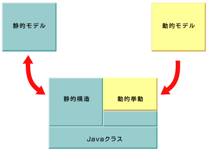 静的モデルは実質的にはクラス図だけですから、Javaとの関係は分かりやすくなっています。それに対し動的モデルは、複数の図を使って重層的に表現されるモデルとJavaの関係を明確にしなければならないため、それほど簡単ではありません。モデルとJavaクラスの関係は、図6のようになります。