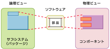 図8は、UMLにおけるサブシステムとコンポーネントの関係を表しています。ソフトウェアを構成する部品は、モデルの論理的なビューの中ではサブシステム(パッケージ)として表現されます。また、モデルの物理的なビューの中ではコンポーネントとして表現されます。