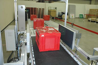 | ベルトコンベアでの読み取りのイメージ。流れているのはプラスチック製コンテナ |