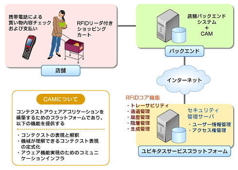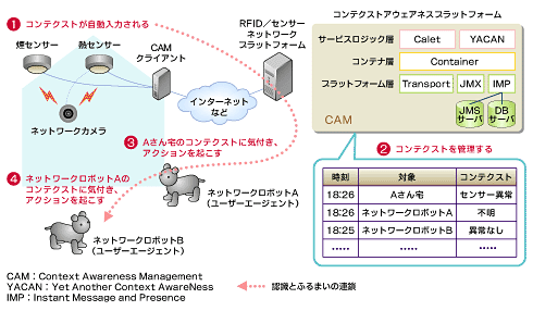 このシステムを実現しているのが、NTTデータで研究開発を行っているCAM(Context Awareness Management)という、コンテクスト・アウェア・アプリケーションを構築するためのプラットフォームである。RFIDやセンサーネットワーク技術を活用して環境や状況といったユーザーを取り巻くコンテクストに気付く(アウェアする)ことを可能にするためには、情報システムのインプットとアウトプットが固定ではなく、状況や要求によってさまざまに変化するに耐えられるようなシステム、とりわけミドルウェアが必要となる、とNTTデータでは考え、CAMの研究開発を行っている。