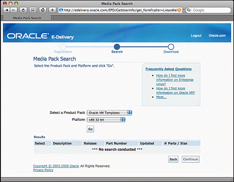 まずE-Deliveryにログインします。次にSelect a Product Packのプルダウンメニューから「Oracle VM Templates」を選択し、Platformから「x86 32bit」を選択して「Go」ボタンをクリックします。