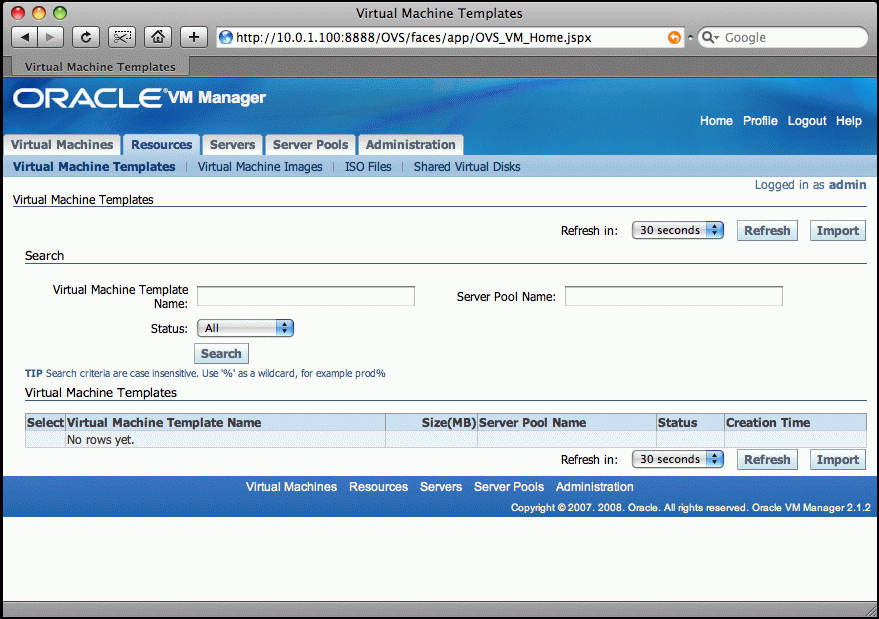 次にVM Managerからこのテンプレートのインポート操作を行います。VM Managerにログインし、「Resources」タブ =>「Virtual Machine Templates」タブを選択し、右上の「Import」ボタンをクリックします。