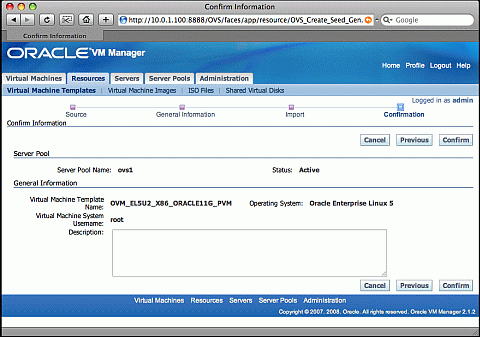 Virtual Machine Template Name:インポートするテンプレート 今回は「OVM_EL5U2_X86_ORACLE11G_PVM」を選択(選択したServer Poolの/OVS/seed_pool/以下にあるディレクトリ名がここにリストされます)