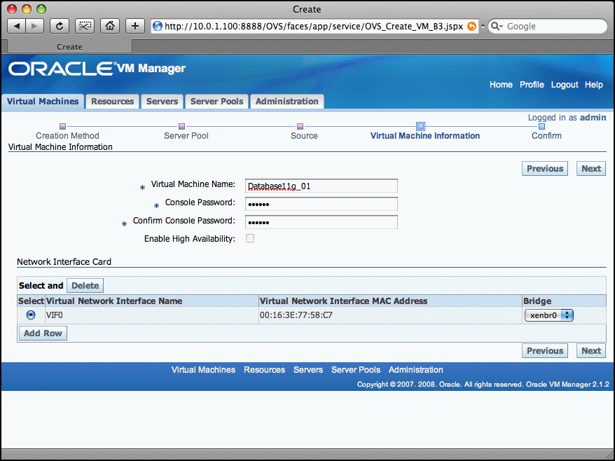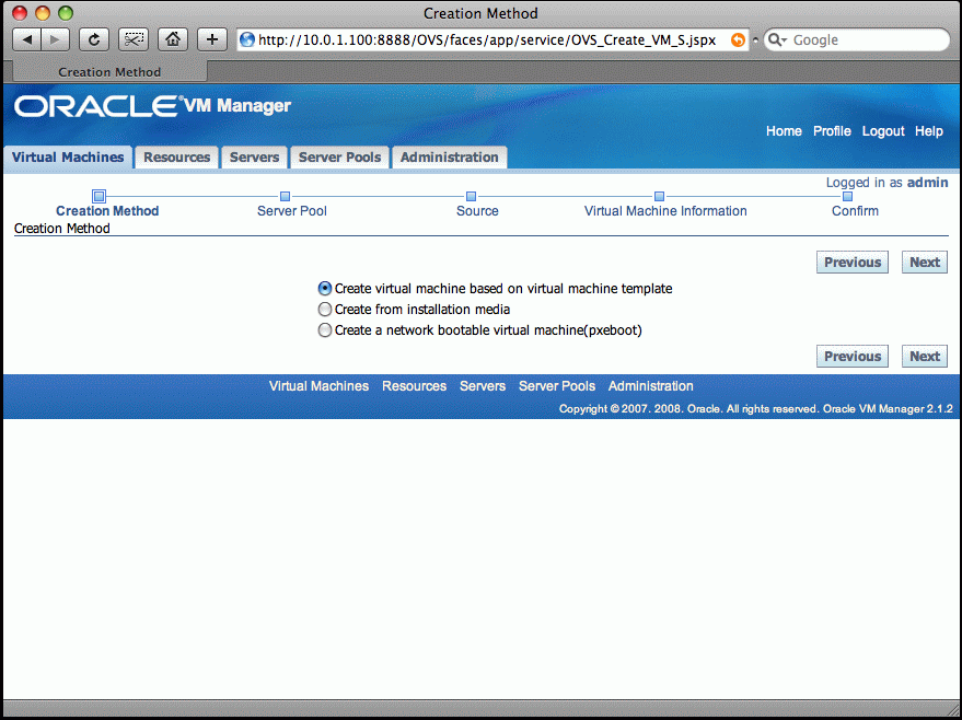 仮想マシンの基になるテンプレートを選択します。今回は先ほどインポートした「OVM_EL5U2_X86_ORACLE11G_PVM」を選択して「Next」をクリックします。