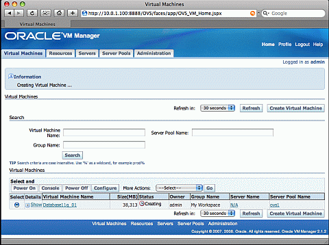 これで作業は完了です。テンプレートイメージのコピー、設定ファイルの作成といった作業が自動的に行われます。仮想マシンの作成が完了するとStatus欄が「Creating」から「Powered Off」に遷移します。「Powered Off」になれば仮想マシンを起動できる状態です。