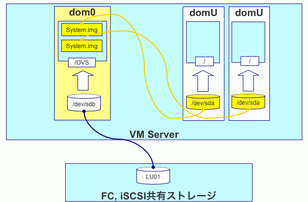 デフォルトのフォーマットで、Oracle VM 2.1.xではVM Managerから仮想化ディスクを追加するとこの形式で作成されます。これはVM Server(正確にはdom0)の/OVS以下の領域にファイルとして仮想ディスクを作成し、それをゲストOSに貸し出す形になります。