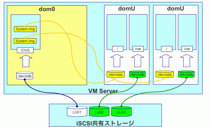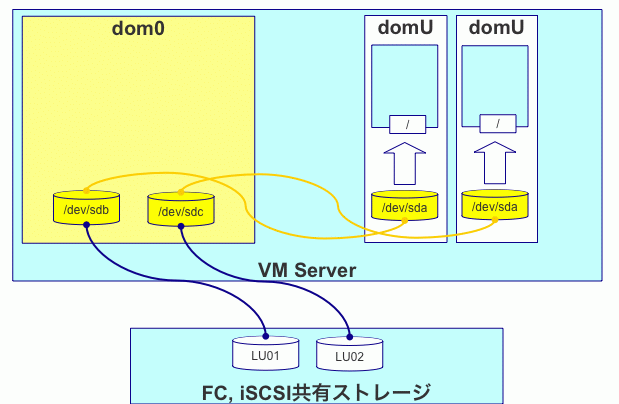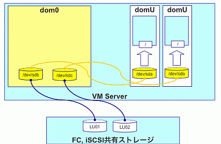 ブロックデバイスVBDとして、VM Server上の/dev/sdbというブロックデバイスをゲストOSに割り当てます。そのときゲストOSからはこの仮想ディスクは/dev/xvdbとして認識されます。また、パーティションを割り当てたい場合はphy:/dev/sdb1,xvdb,wなどとすることで割り当て可能です。