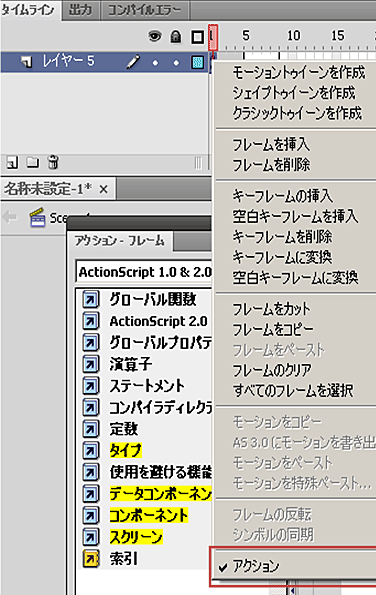 コンテキストメニュー一番下に[アクション]とあります。その項目にチェックが入っていることを確認しましょう。チェックを入れると、以下のようなActionScriptエディタが出現しているはずです。