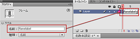 次に、「フレームラベル」について簡単に説明します。フレームラベルは、キーフレームを選択し、[プロパティ]パネルから[ラベル]→[名前]のテキストボックスに値を入力すると、設定されます。