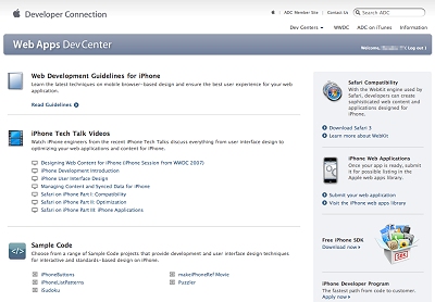 そのほか、iPhone向けWebアプリケーション開発に役立つさまざまなドキュメントや解説ビデオが、米アップルの「Web Apps Dev Center」から入手できます(要登録)。
