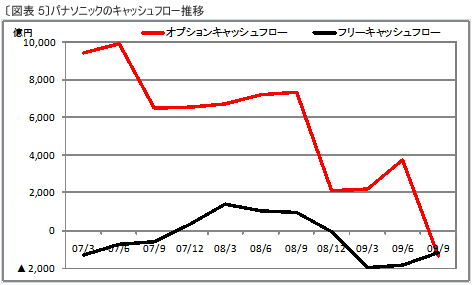 〔図表5〕を見ると、黒い線のフリーキャッシュフローはゼロを挟んで、上下に行ったり来たりのピッチング運動を示している。ところが、オプション・キャッシュフロー(タカダ式フリーキャッシュフロー)は減少傾向を示し、資金に手詰まり感があることを示している。三洋の買収によって今後、これが反転するのかどうか、それがパナソニックの業績回復のカギになるだろう。