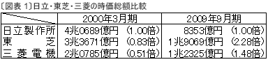 特に三菱電機の時価総額は前世紀まで、日立の3分の1程度でしかなく、総合電機メーカー3社の中では万年最下位と揶揄(やゆ)されていた。ところが2年前(2008年3月期)に、三菱電機が時価総額で日立を追い抜いた。
