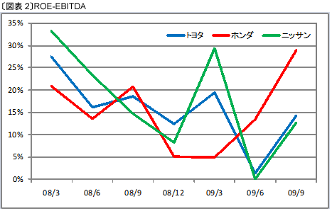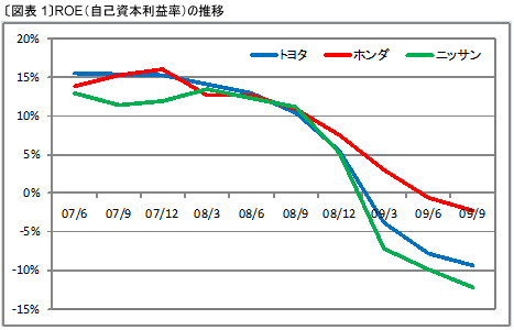 〔図表 1〕は、筆者が収集したデータに基づき、自動車業界大手3社に係るROEの推移を描いたものだ。このコラムを執筆している時点では、いまだ09年12月期のデータを入手していないのでご容赦願いたい。