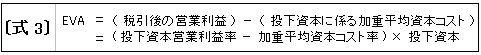 例えば、多くの企業で業績評価の指標として採用されているものに、EVA(Economic Value Added)がある。これは米スターン・スチュワート社が商標登録している指標であり、基本的な式は〔式 3〕で表わされる。